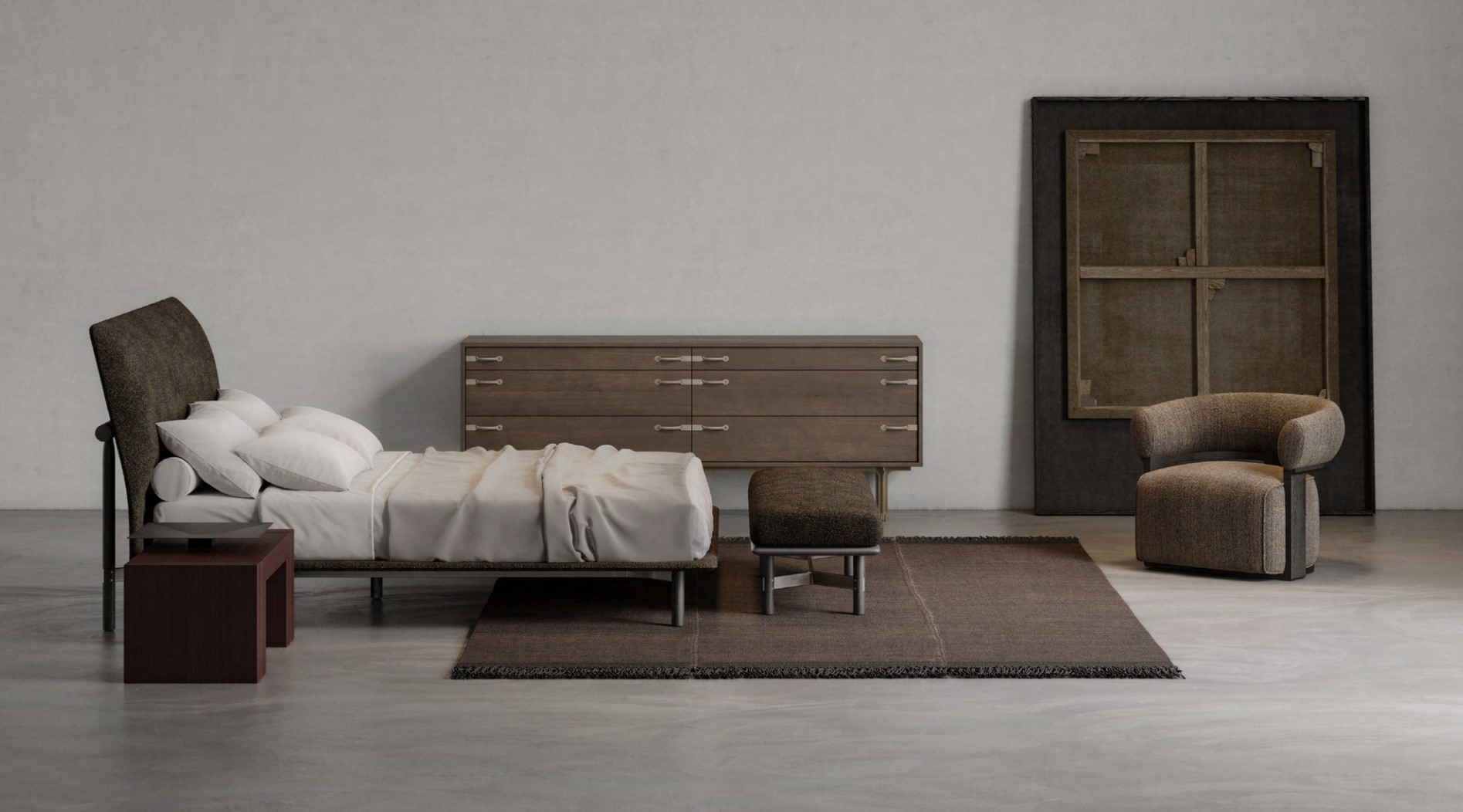 Stilt Bed with its minimal look is designed to maximize relaxing comfort as well as deliver intuitive elegance. Leaning against the collection’s signature oak frame, the headboard, fully upholstered front and back with thick padding, provides an incredibly comfortable and welcoming support, a sensation exalted by the aesthetics of the soft cover and contoured silhouette. The tailoring finishes and finely crafted steel elements at the back transform the Stilt Bed into a refined centerpiece in solitary when placed in the middle of the room.
